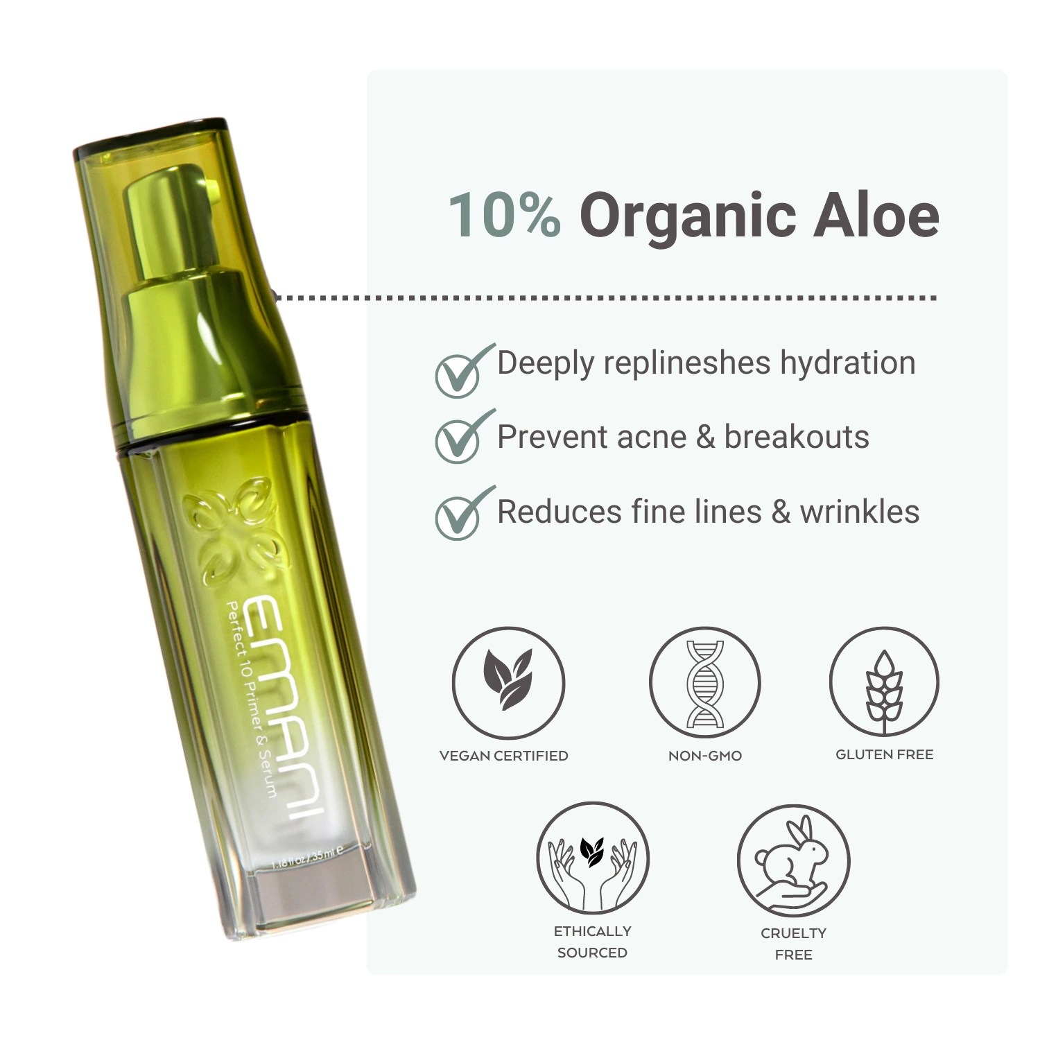 This vegan primer serum will prep, correct, and illuminate your skin with ingredients your skin will love: nourishing coconut extract, aloe vera, rich fatty acid, vitamins, and antioxidants. Our Perfect 10 Vegan Primer Serum is specially formulated to hydrate and balance the skin while protecting your makeup’s vitality, so your skin will feel as refreshed as your makeup looks, even in the late hours! This dual-purpose vegan primer and serum is skincare based - it visibly reduces the appearance of enlarged pores, fine lines, and wrinkles to smooth out and add a luminous radiance to your complexion. It is especially loved and one of our best sellers because it helps fight acne and breakouts in both adults and teens. Our vegan primer is made without parabens, silicone, artificial fragrance, toxic oils, or skin irritants. Your clean primer serum! Enjoy gluten free skincare Australia!